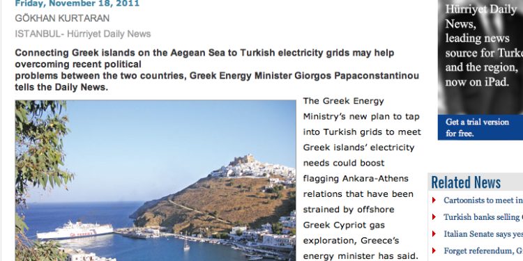 Ηλεκτρική ενέργεια στα ακριτικά νησιά του Αιγαίου από τη Τουρκία; Ακούγεται παράλογο και ανήκουστο. Μόνο που η ηλεκτρονική έκδοση της τουρκικής εφημερίδας ΧΟΥΡΙΕΤ, η οποία δημοσιεύει τη σχετική είδηση, επικαλείται τις δηλώσεις του κ.Γιώργου Παπακωνσταντίνου,αρμόδιου Έλληνα υπουργού,στο περιθώριο οικονομικού φόρουμ στην Κωνσταντινούπολη!