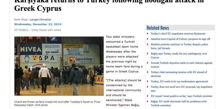 Οι τούρκοι εκμεταλλεύονται με τον πιο έντονο τρόπο , την επίθεση που δέχθηκε η τουρκική ομάδα μπάσκετ Καρσίγιακα με το ΑΠΟΕΛ στην Κύπρο. Στα επεισόδια που σημειώθηκαν στο βράδυ της Τετάρτης, Κύπριοι εισέβαλλαν στο γήπεδο και ξυλοκόπησαν τους παίχτες και παράγοντες της τουρκικής ομάδας.