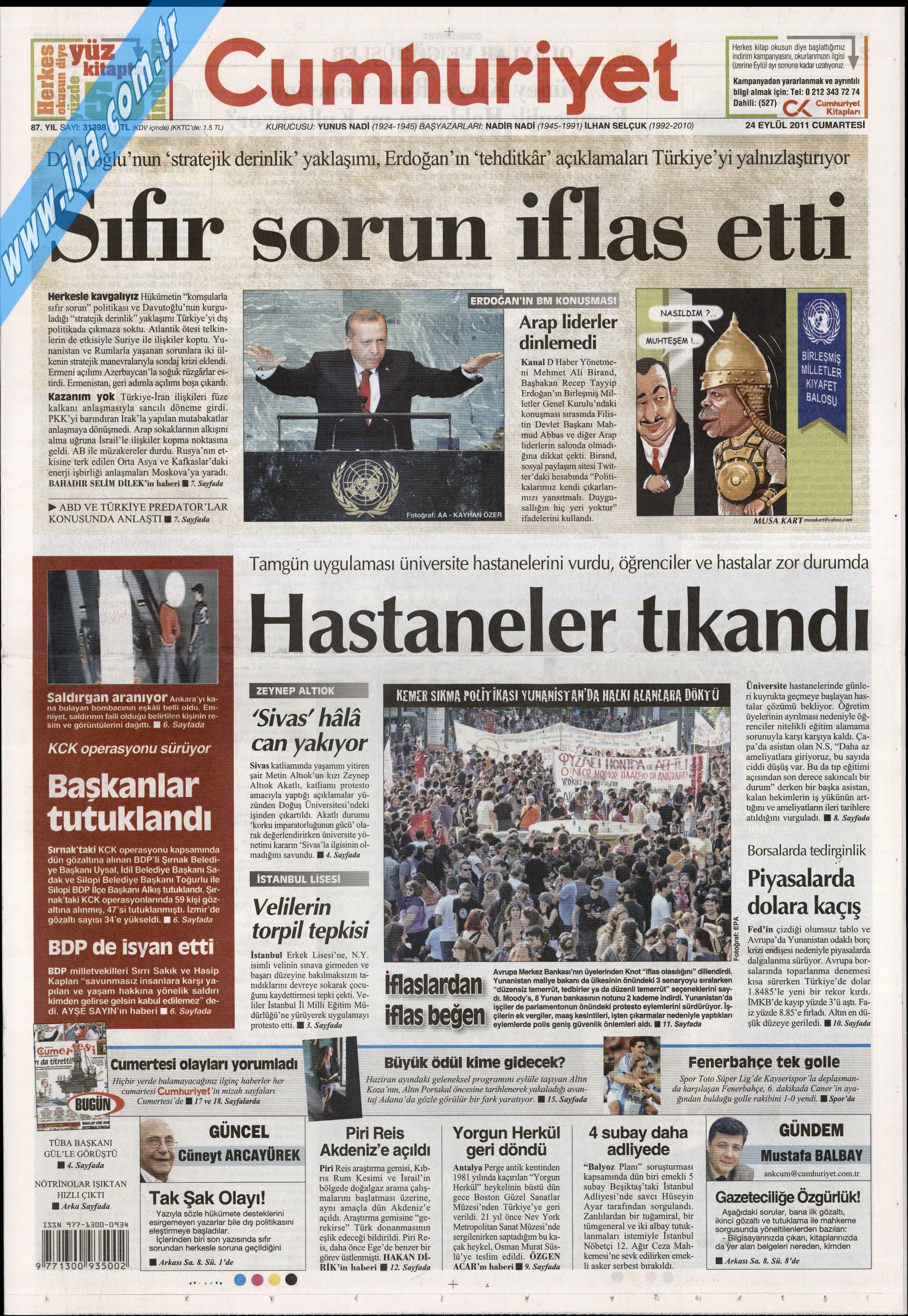 Η Cumhuriyet έχει ως τίτλο « το μηδενικό πρόβλημα ..χρεοκόπησε». Η Τουρκική εφημερίδα αναφέρει πως η πολιτική Νταβούτογλου με «στρατηγικό βάθος» και την επιθετικότητα του Ερντογάν έχουν απομονώσει την Τουρκία. Η εφημερίδα αναφέρει πως τους τελευταίους μήνες η Άγκυρα επιδείνωσε τις σχέσεις της με τη Συρία, το Ισραήλ, την Ελλάδα, την Κύπρο και την Αρμενία ακόμη και με το Ιράν. Η Cumhuriyet αναφέρει επίσης πως στην ομίλία του Ερντογάν στον ΟΗΕ δεν βρέθηκε στην αίθουσα κανένας Άραβας ηγέτης ούτε και ο Παλαιστίνιος ηγέτης Μαχμούτ Αμπάς!