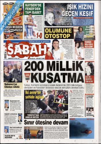 «Αποκλεισμός 200 μιλίων» είναι ο τίτλος της τουρκικής εφημερίδας Sabah η οποία αναφέρει πως η Άγκυρα έχει σαν δόγμα « η ΑΟΖ της Τουρκίας επεκτείνεται στα 200 μίλια». Η τουρκική εφημερίδα αναφέρει ότι το Πίρι Ρείς ξεκίνησε το ταξίδι του με αρχικό στόχο τις έρευνες στο όριο των 12 μιλίων του «Ψευδοκράτους» αλλά αναφέρει πως σε περίπτωση κριθεί «αναγκαίο» το ερευνητικό σκάφος θα κάνει έρευνες και στις νοτιοδυτικές ακτές τις Κύπρου. Ένα σημείο που συμπίπτει με την περιοχή ερευνών της Κυπριακής Δημοκρατίας. Η Sabah τονίζει πως το τουρκικό Επιτελείο εξετάζει το ενδεχόμενο της εγκατάστασης τουρκικών F-16 στα Κατεχόμενα.