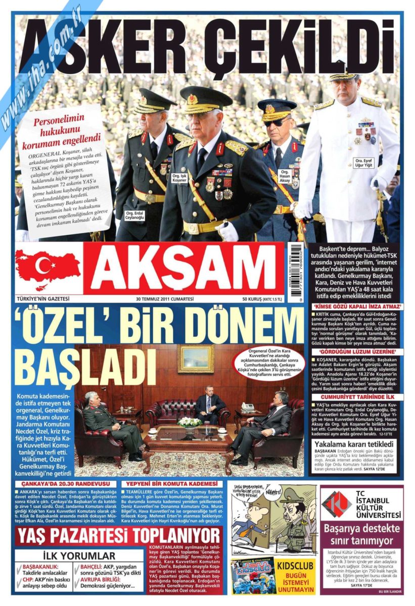 Η εφημερίδα «Αkşam» έχει τίτλο » ο στρατός υποχώρησε» και τονίζει πως οι αρηχγοί παραιτήθηκαν μετά απο τις διαδοχικές συλλήψεις αξιωματικών. Η τουρκική εφημερίδα κάνει αναφορά και στο νέο αρχηχό των Ενόπλων Δυνάμεων ο οποίος θα είναι ο Νετζντέτ Οζέλ