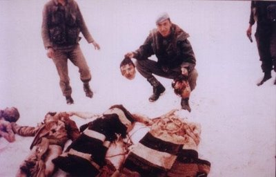 Δύο φωτογραφίες παρόμοιες. Η έγχρωμη φωτογραφία που βλέπετε δημοσιεύτηκε στην δεκαετία του 1990 στην αγγλόφωνη εφημερίδα ¨The European¨ και δείχνει Τούρκους στρατιώτες που κρατάνε υπέρήφανοι κομμένα κεφάλια Κούρδων ανταρτών.