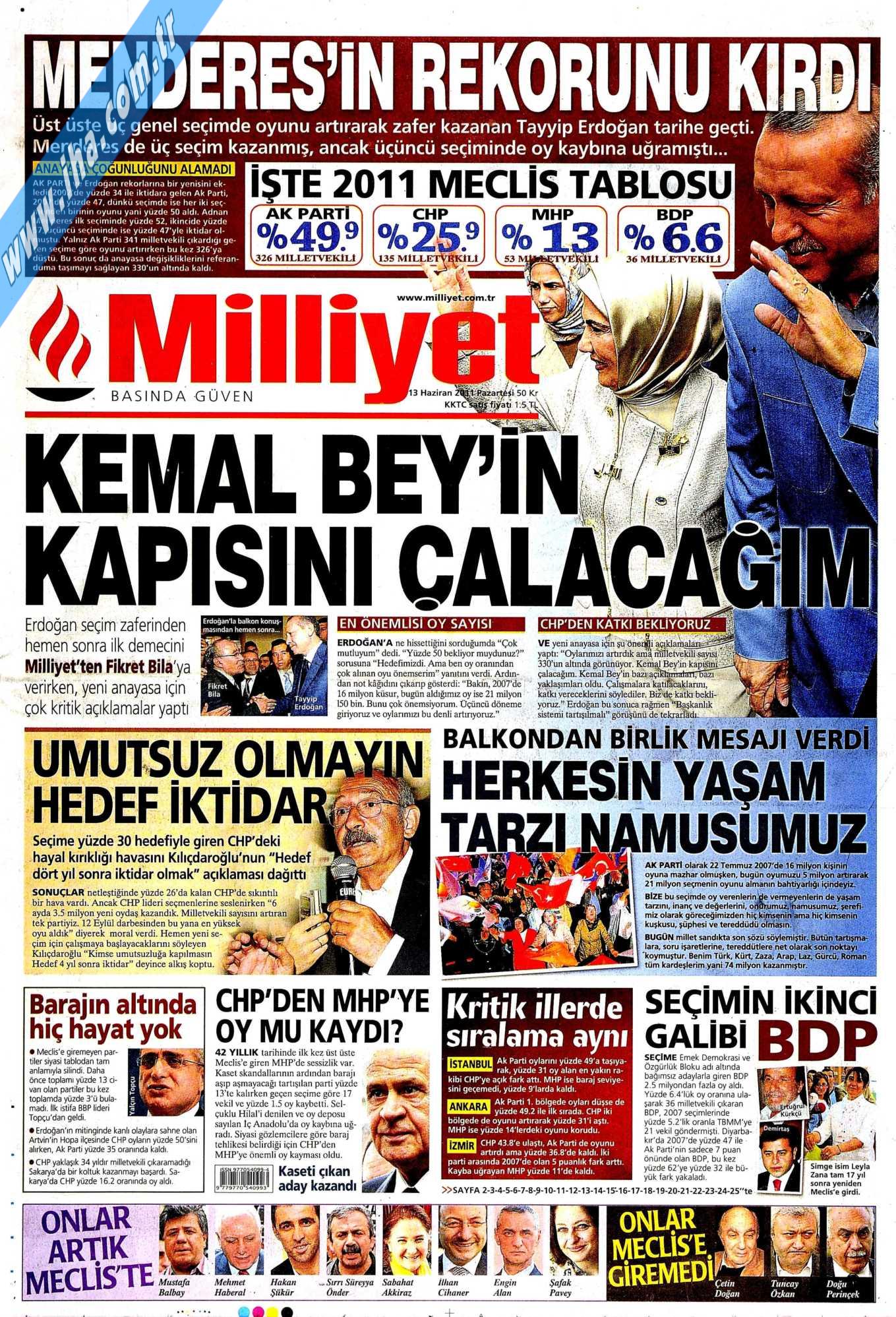 Η Milliyet έχει τίτλο «έσπασε το ρεκόρ του Μεντερές».Η τουρκική εφημερίδα γράφει « ο Ερντογάν πέρασε στην ιστορία με τρεις διαδοχικές νίκες στις εκλογές όπου αύξησε σε όλες τις εκλογές τα ποσοστά του. Τρεις νίκες είχε και ο Μεντερές αλλά στις τελευταίες εκλογές είχαν μειωθεί τα ποσοστά του».