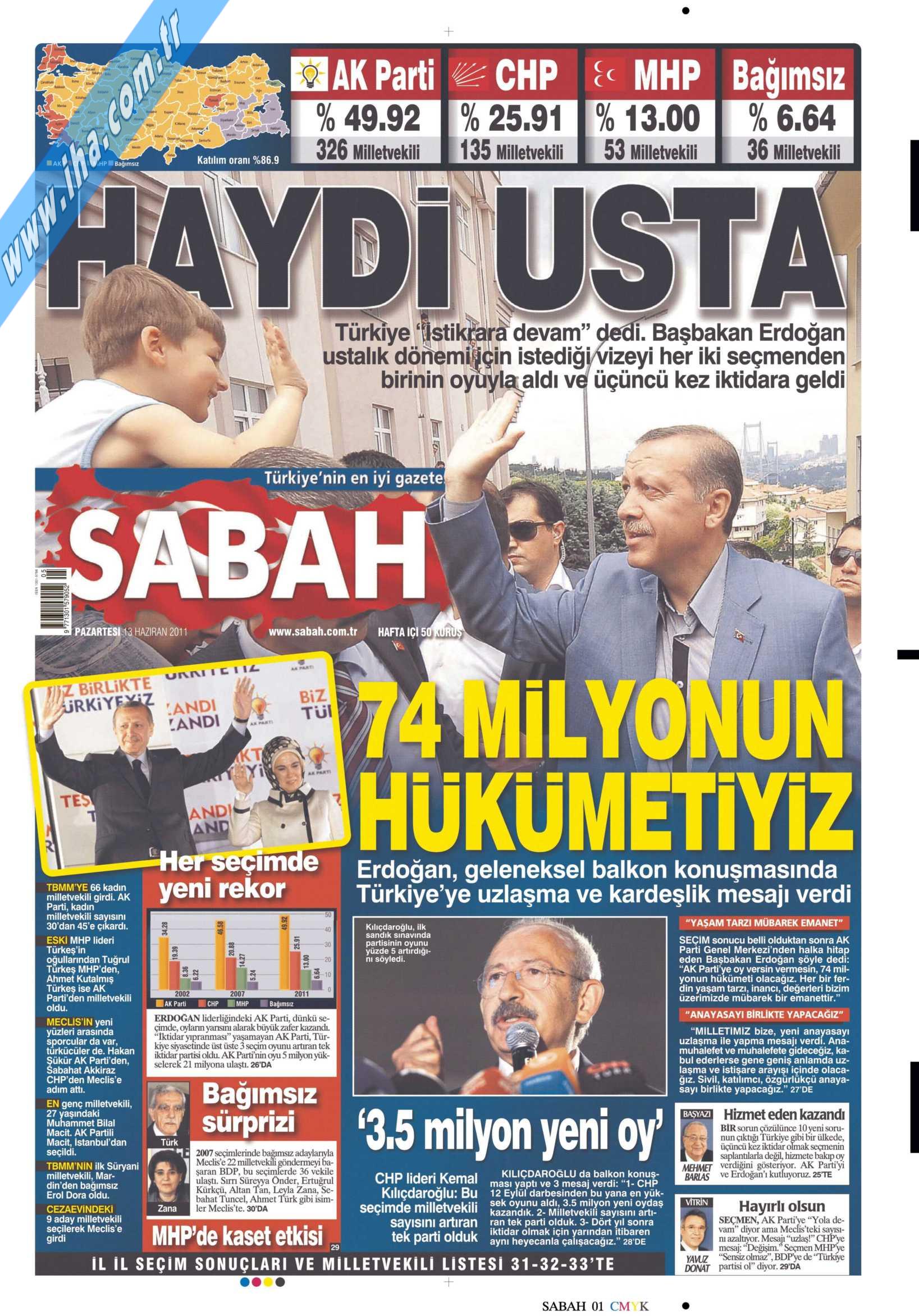 Η Sabah έχει τίτλο « ΄Αϊντε μάστορα» και τονίζει ότι η Τουρκία με την υποστήριξη που έδωσε στον Ερντογάν «ζήτησε σταθερότητα. Και στην τρίτη θητεία του Ερντογάν που την είχε ζητήσει πια ως μάστορας ήρθε με μια από τις δύο ψήφους»