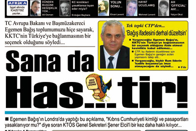 «Αϊ σιχτίρ κι εσένα »! λένε οι τουρκοκύπριοι στον Υπουργό Ε.Ε. Εγκεμέν Μπαγίς, ο οποίος είχε δηλώσει πως σε περίπτωση που δεν επιλυθεί το Κυπριακό ζήτημα «η Βόρεια Κύπρος μπορεί να ενσωματωθεί στην Τουρκία»