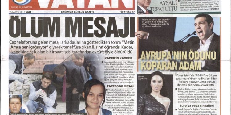 Πρωτοσέλιδο αφιέρωμα κάνει τον Αλέξη Τσίπρα η εφημερίδα Vatan. “ O άνθρωπος που τρόμαξε την Ευρώπη» έχει ως τίτλο η τουρκική εφημερίδα που αναφέρει πως ο ηγέτης του ΣΥΡΙΖΑ δηλώνει πως « δεν θα ξεπουλήσει τη χώρα του στο ΔΝΤ και στην Ε.Ε», έρχεται στην εξουσία. Η Vatan αναφέρει πως σε περίπτωση που γίνουν εκλογές τον Ιούνιο αναμένεται ο Τσίπρας, ο οποίος θεωρείται ως «λαϊκός ήρωας» να αναλάβει την εξουσία