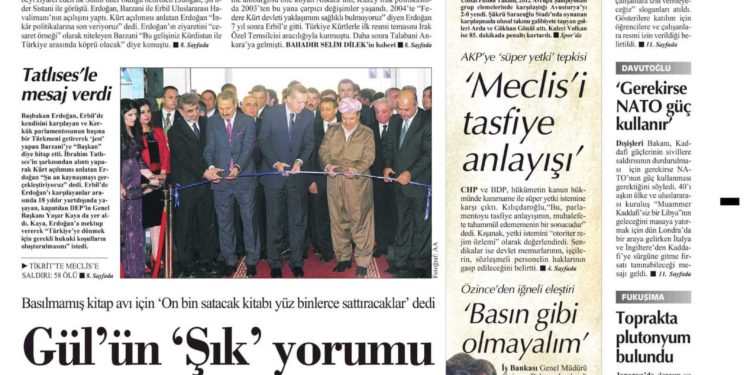 » Η επίσκεψη με πολλές πρωτιές» είναι ο τίτλος της Cumhuriyet σχετικά με την επίσκεψη Ερντογάν. Η τουρκική εφημερίδα γράφει » έχουν γίνει μεγάλες αλλαγές στην πολιτική μας σχετικά με το Κουρδικό ζήτημα. Κάποτε η Άγκυρα είχε βάλει εμπάργκο στις συναντήσεις με τον Ταλαμπανί και τον Μπαρζανί. Το 2003 ο Ερντογάν δήλωνε πως είναι εναντίον ενός αυτόνομου Κουρδικού κράτους, αλλά χθές επισκέφθηκε το Βόρειο Ιράκ και το Έρμπιλ!¨»