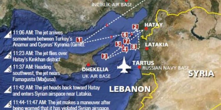 Στο χάρτη που δημοσιεύει η τουρκική ΧΟΥΡΙΕΤ,αποτυπώνεται η πτήση του RF 4.Από την οποία προκύπτει ξεκάθαρα ότι το αεροσκάφος πέταξε αρχικά στη Κύπρο για να φωτογραφήσει πιθανόν την άσκηση της Εθνοφρουράς.Στη συνέχεια κατευθύνθηκε στα παράλια της Συρίας,μετά πέταξε πάλι στη Κύπρο,αυτή τη φορά από το νότο και στη συνέχει επέστρεψε στα παράλια της Συρίας,όπου και καταρρίφθηκε.