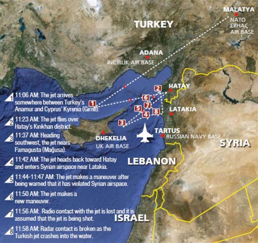 Στο χάρτη που δημοσιεύει η τουρκική ΧΟΥΡΙΕΤ,αποτυπώνεται η πτήση του RF 4.Από την οποία προκύπτει ξεκάθαρα ότι το αεροσκάφος πέταξε αρχικά στη Κύπρο για να φωτογραφήσει πιθανόν την άσκηση της Εθνοφρουράς.Στη συνέχεια κατευθύνθηκε στα παράλια της Συρίας,μετά πέταξε πάλι στη Κύπρο,αυτή τη φορά από το νότο και στη συνέχει επέστρεψε στα παράλια της Συρίας,όπου και καταρρίφθηκε.