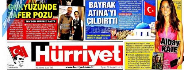 Η τουρκική εφημερίδα Hürriyet στο πρωτοσέλιδο της έχει τη φωτογραφία της τουρκικής σημαίας , σε εκκλησία της Σαντορίνης όπου είχε δημοσιεύσει εφημερίδα της Ολλανδίας. Η σημαία ξετρέλανε την Αθήνα» είναι ο τίτλος της τουρκικής εφημερίδας που κάνει αναφορά στις αντιδράσεις που προέκυψαν λόγω αυτού του δημοσιεύματος.