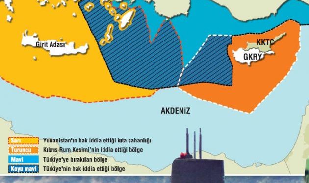 Στην επεξήγηση του χάρτη οι Τούρκοι χρωματίζουν με κίτρινο χρώμα την “υφαλοκρηπίδα που οι Έλληνες ισχυρίζονται πως κατέχουν”,με πορτοκαλί της Κύπρου και μετά αρχίζουν τα παράλογα.
