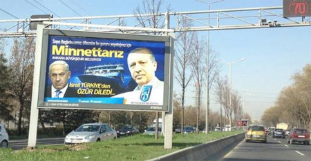 Ο δήμος της Άγκυρας γέμισε όλα τα διαφημιστικά πανό της τουρκικής πρωτεύουσας με αφίσες που απευθύνονται στον Ερντογάν γράφουν «είμαστε ευγνώμονες, το Ισραηλ ζήτησε συγγνώμη από την Τουρκία»!