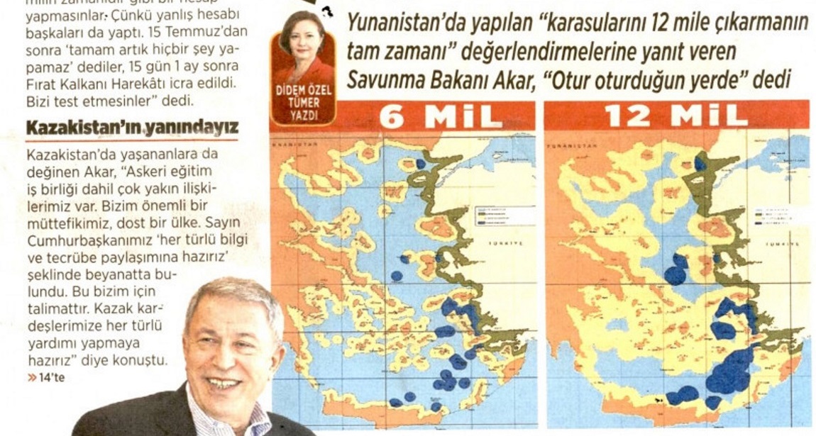 Όπως ανέφερε ο ανταποκριτής του ΣΚΑΙ στην Κωνσταντινούπολη, Μανώλης Κωστίδης, η Milliyet έχει στο πρωτοσέλιδό της δύο χάρτες που παρουσίασε χθες ο Ακάρ που αποτυπώνουν την τουρκική οπτική για το Αιγαίο πριν και μετά την ενδεχόμενη επέκταση των ελληνικών χωρικών υδάτων, δηλαδή στα 6 και τα 12 μίλια.