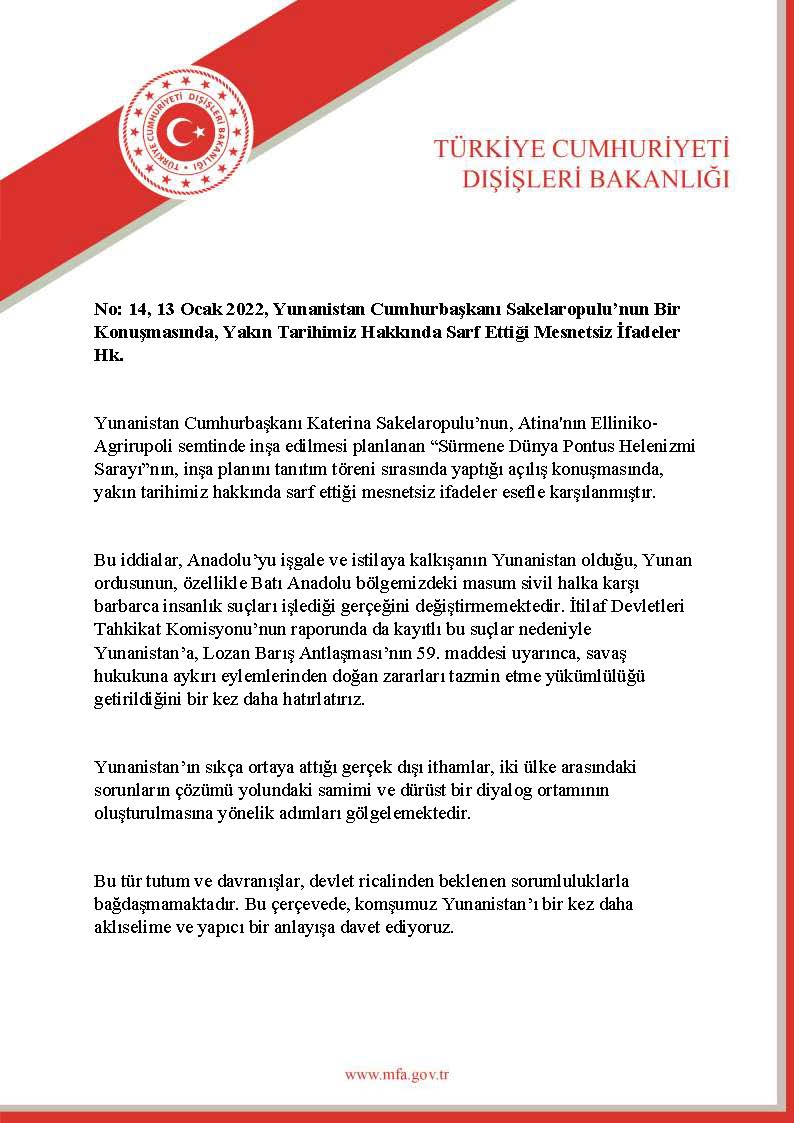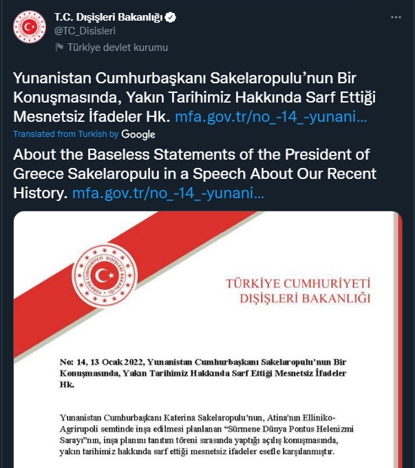 «Με λύπη έγιναν δεκτές οι αβάσιμες δηλώσεις της Ελληνίδας Προέδρου Κατερίνας Σακελλαροπούλου κατά την τελετή παρουσίασης του σχεδίου ανέγερσης του Μεγάρου Παγκόσμιου Ποντιακού Ελληνισμού Σουρμένων στον χώρο του πρώην αεροδρομίου Ελληνικού.