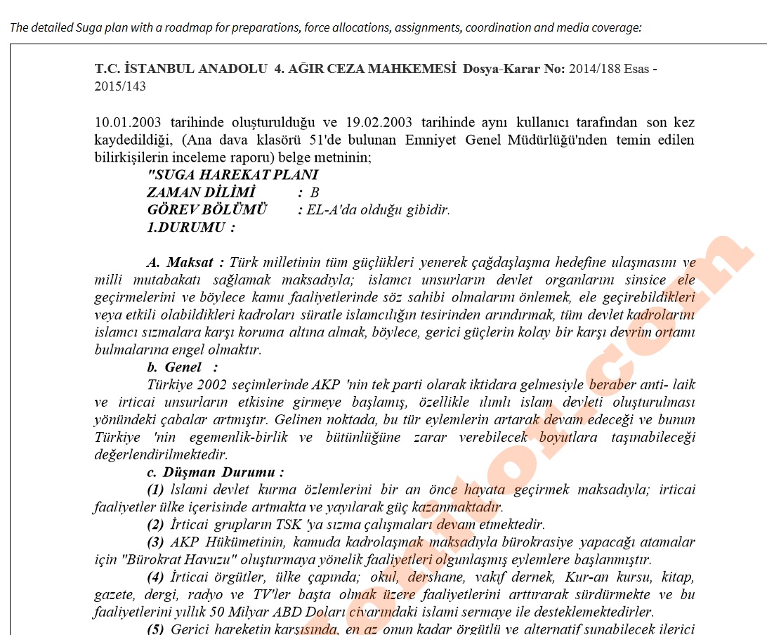 «Οι ερευνητές διαπίστωσαν ότι το σχέδιο Suga προετοιμάστηκε στις 10/1/2003, από τον τότε επικεφαλής σχεδιασμού των ναυτικών δυνάμεων συνταγματάρχη Γκιουρντενίζ. Παρουσιάστηκε για υπογραφή εκ μέρους του διοικητή του Πολεμικού Ναυτικού Ναυάρχου Οζντέν Ορνέκ στις 3/2/2003. Σύμφωνα με έκθεση στρατιωτικών εμπειρογνωμόνων στο σκληρό δίσκο βρέθηκαν εκατοντάδες έγγραφα που έδειξαν ότι το σχέδιο πράγματι είχε τεθεί σε εφαρμογή και έχει γίνει σημαντική πρόοδος στο προπαρασκευαστικό στάδιο», αποκαλύπτει ο Μποζκούρτ.