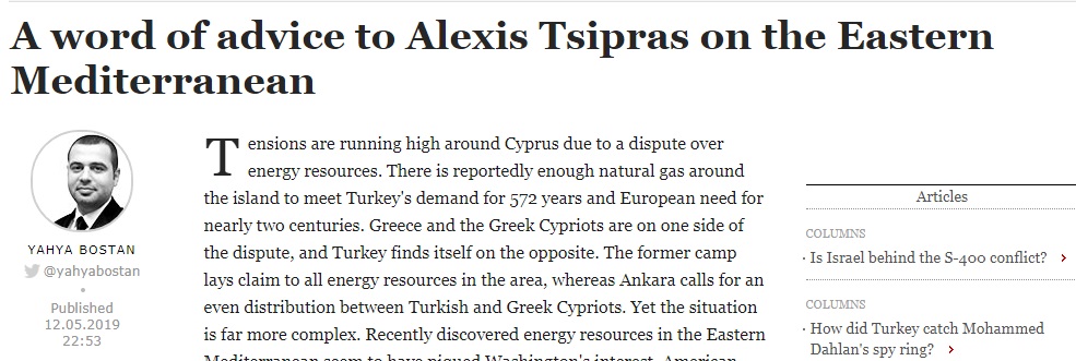 «Δεύτερον, ακόμη κι αν οι σχέσεις Τουρκίας-ΗΠΑ επιδεινωθούν μόνιμα, η Ελλάδα μπορεί να αντιμετωπίσει σοβαρά προβλήματα αν επιχειρήσει να καθορίσει τις σχέσεις της με την Άγκυρα βασιζόμενη σε κάποιον τρίτο. Η Τουρκία δεν θα χάσει τα ζωτικά της συμφέροντα στην Ανατολική Μεσόγειο, ασχέτως των αντιπάλων της. Το 1974 η Άγκυρα ανέπτυξε τα στρατεύματά της στην Κύπρο, παρά την επιστολή του Αμερικανού Προέδρου Τζόνσον το 1964, διακινδυνεύοντας ένα αμερικανικό εμπάργκο. Ο Τσίπρας δεν μπορεί να υπηρετήσει τα συμφέροντα της χώρας του, βασιζόμενος στις σχέσεις της Τουρκίας με μακρινά Έθνη. Αν μη τι άλλο θα θυμώσει την Άγκυρα και θα πληρώσει το τίμημα«, συνεχίζει ο Bostan.