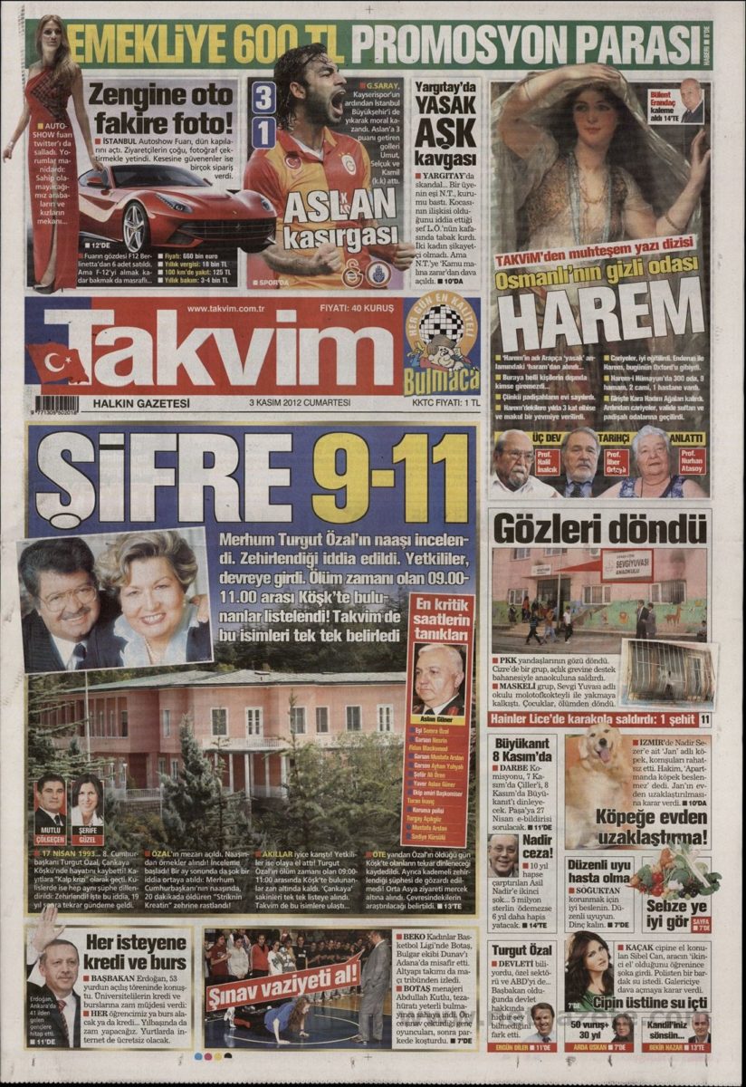 Τους τρόπους που ερευνούν οι αρχές την υπόθεση της πιθανότητας δηλητηρίασης του Τουργκούτ Οζάλ αναφέρει η εφημερίδα Takvim με τίτλο «κωδικός 09-11». Η τουρκική εφημερίδα αναφέρει πως οι αστυνομικές αρχές σε συνεργασία με τον εισαγγελέα έχουν ήδη διαπιστώσει ποια ήταν τα ονόματα που βρίσκονταν στο προεδρικό μέγαρο Τσάνκαγια την ημέρα του θανάτου του Οζάλ κυρίως τις ώρες από τις 9 το πρωϊ μέχρι τις 11 όπου πέθανε.