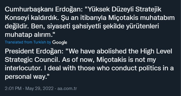 «Τερματίσαμε τις Συνεδριάσεις του Στρατηγικού Συμβουλίου Υψηλού Επιπέδου με την Ελλάδα; Το εξηγήσαμε αυτό; Τι σημαίνει αυτό; Σημαίνει «Ελλάδα, τακτοποίησε τον εαυτό σου». Δεν τακτοποιήσατε τον εαυτό σας, οπότε καταργήσαμε το Στρατηγικό Συμβούλιο Υψηλού Επιπέδου. Ο Μητσοτάκης δεν είναι πλέον συνομιλητής μου από τώρα. Γιατί; Αντιμετωπίζω ανθρώπους που ασκούν πολιτική με προσωπικό τρόπο…Είμαστε φίλοι με αυτούς που είναι φίλοι μαζί μας, αλλά θα πρέπει να γνωρίζουν καλά ότι θα κάνουμε ό,τι είναι απαραίτητο με αυτούς που μας βλέπουν ως εχθρούς».
