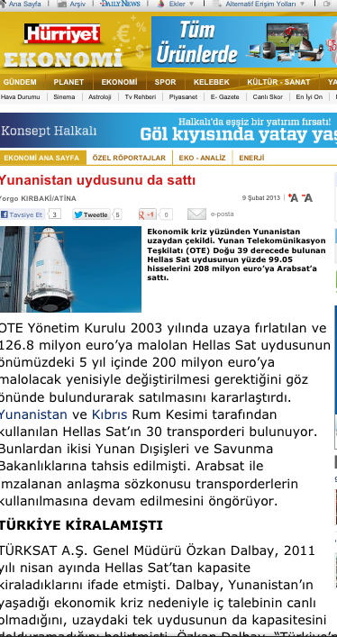 Η Hürriyet γράφει επίσης πως δυο αναμεταδότες του δορυφόρου είχαν παραχωρηθεί στο ελληνικό υπουργείο Άμυνας και στο Υπουργείο Εσωτερικών ενώ στο παρελθόν και η Τουρκία είχε νοικιάσει συχνότητες για τηλεοπτικά δίκτυα.