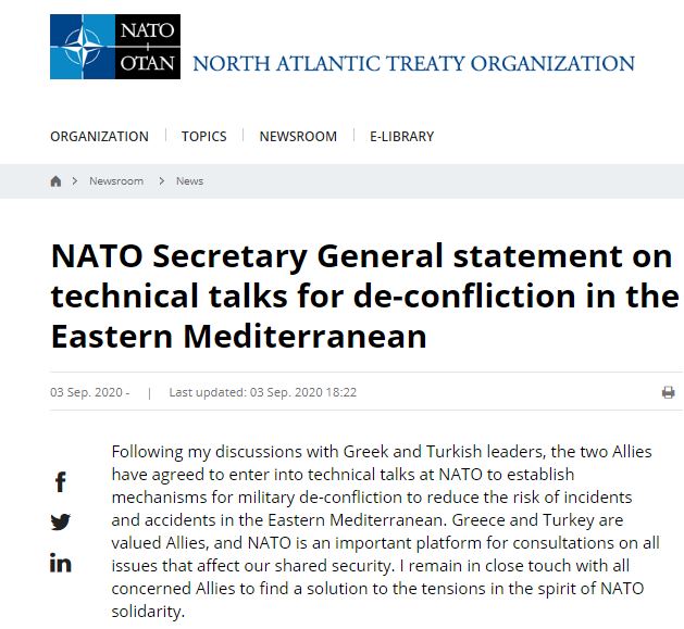 Following my discussions with Greek & Turkish leaders, the two Allies have agreed to enter into technical talks at #NATO to establish deconfliction mechanisms and reduce the risk of incidents & accidents in the #EastMed. https://t.co/Kc70MlNPzY
