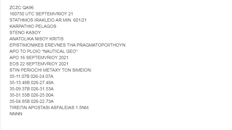 Συγκεκριμένα, ο σταθμός Ηρακλείου της Ελληνικής Υδρογραφικής Υπηρεσίας εξέδωσε Navtex ενημερώνοντας για επιστημονικές έρευνες του πλοίου Nautical Geo στο Καρπάθιο πέλαγος, μεταξύ Κρήτης και Κάσου.