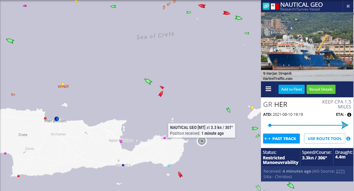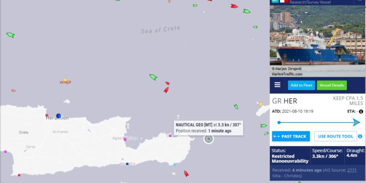 Πάντως ασχέτως της τουρκικής κίνησης, το υπό σημαία Μάλτας ερευνητικό πλοίο Nautical Geo – που κάνει προεργασίες ενόψει χάραξης της διαδρομής του αγωγού EAST MED – συνεχίζει την πορεία του, όπως αποτυπώνεται και στους χάρτες του Marine Traffic: