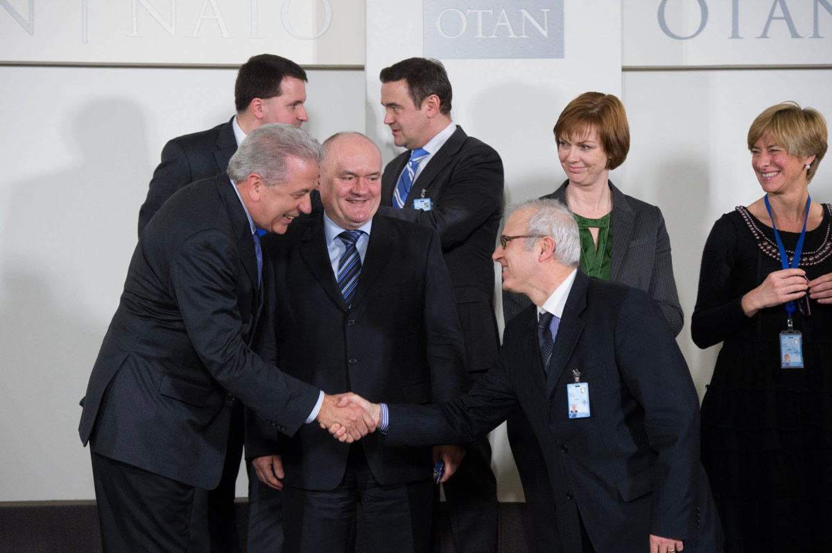 Η ελληνική αντιπροσωπεία με επικεφαλής τον υπουργό Εθνικής Άμυνας κ. Δημήτρη Αβραμόπουλο βγήκε από την αίθουσα και ο Έλληνας υπουργός κατευθύνθηκε προς τη θέση του. Αφού χαιρέτησε τον Ούγγρο ομόλογό του κ. Ζάμπα Χέντε, στάθηκε περιμένοντας τους συναδέλφους του για το «κλικ» των δέκα δευτερολέπτων. Εκείνη τη στιγμή, από την κάτω σειρά ο Μόνιμος Αντιπρόσωπος της Τουρκίας στο ΝΑΤΟ, πρέσβυς κ. Μεχμέτ Φατίχ Τσεϊλάν.