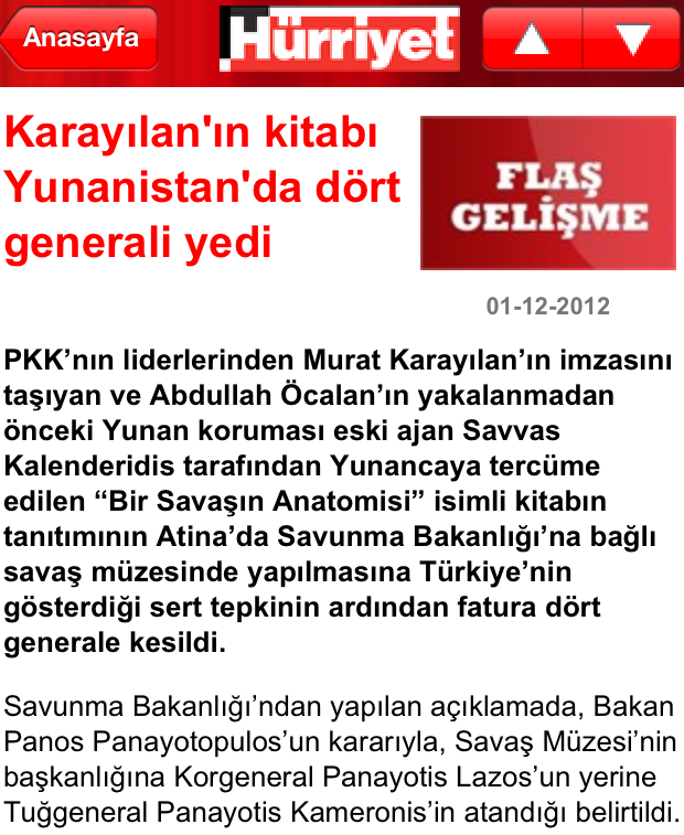 «Το βιβλίο του Καράγιλαν «έφαγε» 4 στρατηγούς στην Ελλάδα» είναι ο τίτλος της τουρκικής εφημερίδας Hürriyet.