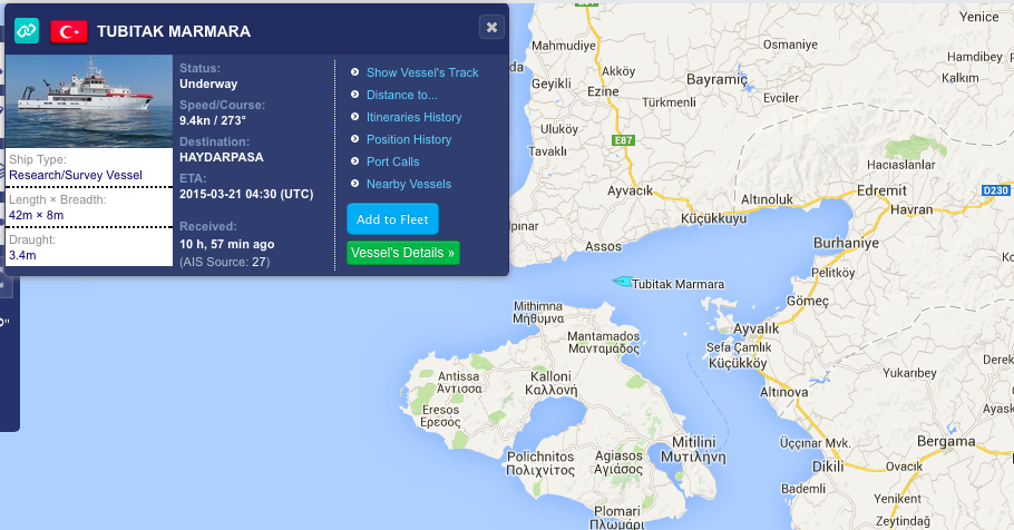 65 παραβιάσεις στο Αιγαίο μέσα σε λίγες ώρες την Πέμπτη από τουρκικα αεροσκάφη και ελικόπτερα. Πυραυλάκατος του τουρκικού ναυτικού …δένει αναοιχτά από το Αγαθονήσι και περιφέρεται ασκόπως επί τρίωρο σε ελληνικά ύδατα! Και όπως αναγνώστης του Onalert.gr μας επεσήμανε ένα από τα “ερευνητικά” σκάφη των Τούρκων το Tibukat Marmara, πλέει εδώ και μέρες στο Αιγαίο . Η τελευταία περιοχή που πλέει το τουρκικό σκάφος είναι αυτή που βλέπετε στον χάρτη του marinetraffic.com!