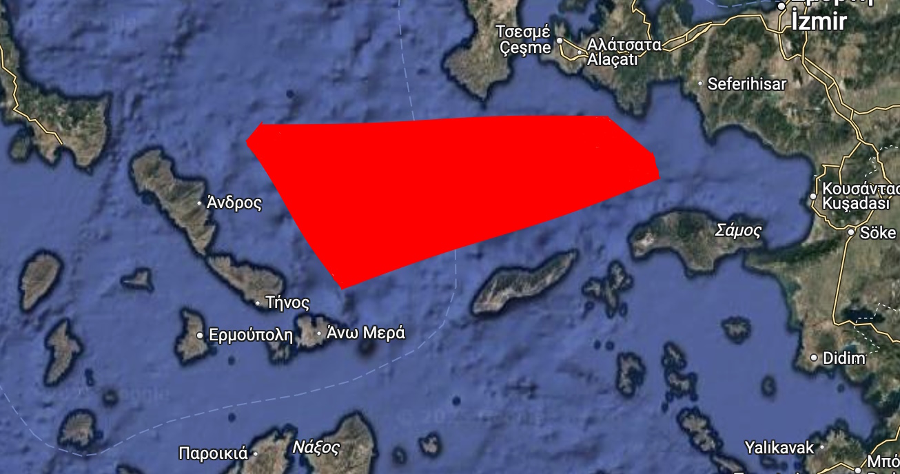 Η περιοχή που δεσμεύει η Τουρκία για τις αεροναυτικές ασκήσεις εκτείνεται σε μια αρκετά μεγάλη έκταση, όπως φαίνεται στην παρακάτω φωτογραφία, ανάμεσα σε Χίο, Σάμο, Άνδρο, Μύκονο και Ικαρία.