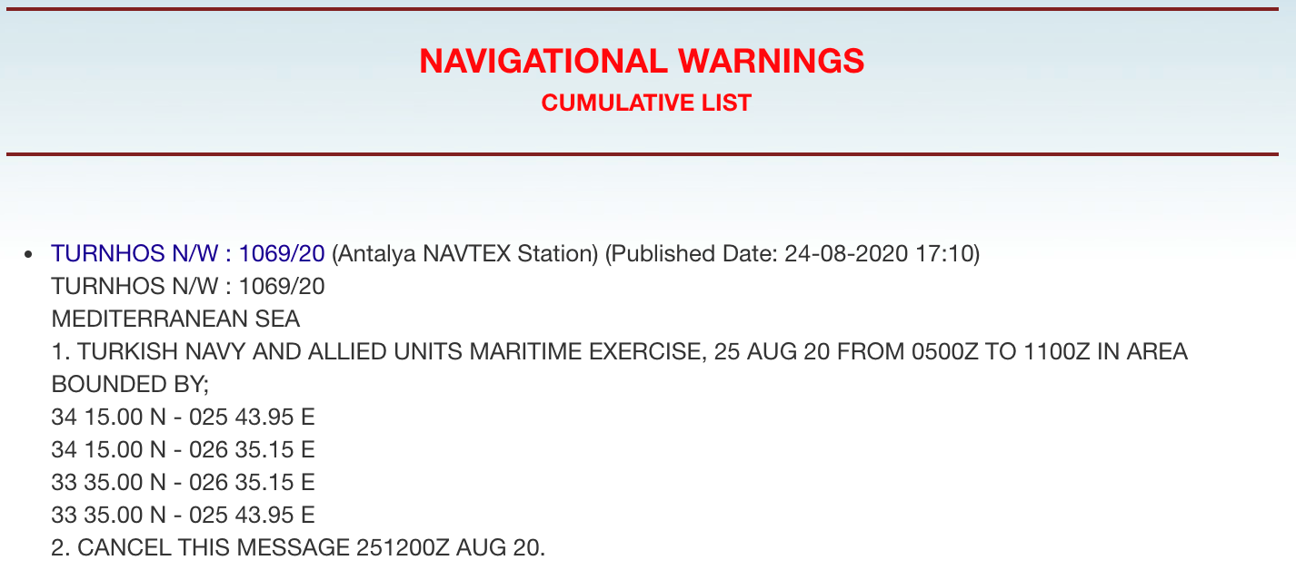 Η ΝΑVTEX με αριθμό 1069/20 έχει ισχύ από τις 5 τα ξημερώματα της 25ης Αυγούστου έως τις 11 το πρωί της ίδιας ημέρας: