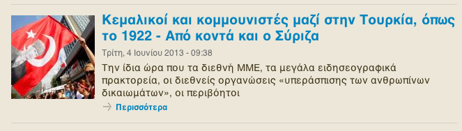 Οι Χρυσαυγίτες παντως τα έχουν ξεκαθαρίσει τα πράγματα. “Κεμαλιστές και κομμουνιστές μαζί όπως το 1922”, είναι ο τίτλος άρθρου που αναδημοσιεύουν στην επίσημη ιστοσελίδα τους!!! Δεν ξέρουμε αν “θα καθαρίσουν τον τόπο” ,όπως “υπόσχονται” από ανάλυση πάντως των διεθνών εξελίξεων ο Θεός να μας φυλάξει! Και μια και τον αναφέραμε; Είναι δυνατόν η Χρυσή Αυγή που εσχάτως ασπάστηκε τον Χριστιανισμό να υποστηρίζει έναν ισλαμιστή;