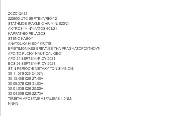 Ο υδρογραφικός σταθμός Ηρακλείου ανανέωσε χθες με ναυτική αναγγελία τη συνέχιση των ερευνών του γαλλικού πλοίου από τις 24 έως τις 26 του μηνός.