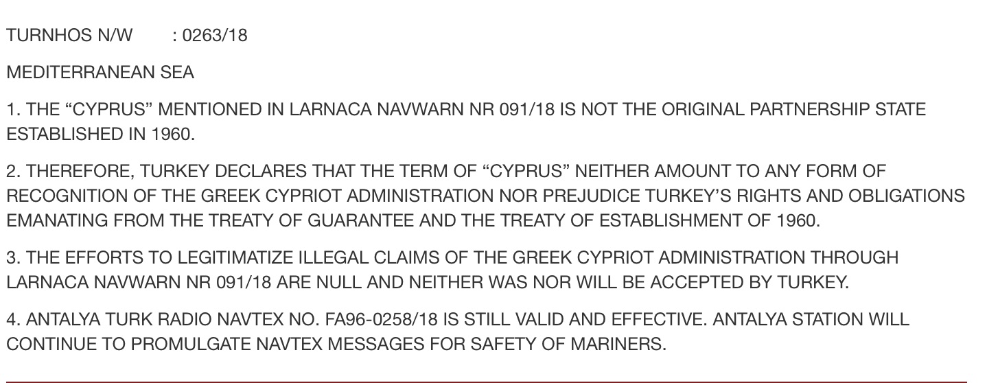 Ο προκλητικός σταθμός της Αττάλειας τροφοδότησε κι άλλο το κλίμα έντασης και επιχειρώντας να κάνει το άσπρο – μαύρο εξέδωσε με τη σειρά του αντι – NAVTEX, στην οποία επιχειρεί να κάνει το άσπρο – μαύρο και υποστηρίζει ότι η Κυπριακή ναυτική οδηγία δεν είναι τίποτε άλλο από: «προσπάθειες νομιμοποίησης των παρανόμων αξιώσεων της Ελληνοκυπριακής κυβέρνησης» τις οποίες χαρακτηρίζει επίσης  »άκυρες» επισημαίνοντας ότι «δεν θα γίνουν δεκτές ούτε από την Τουρκία.»