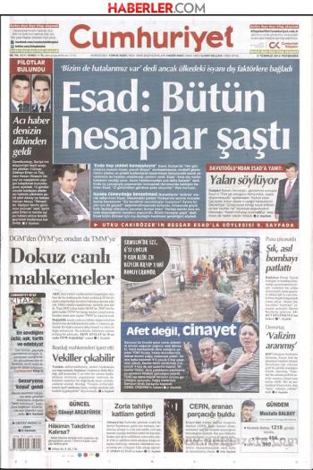 Για πρώτη φορά ο Μπάσαρ Άσαντ παραδέχεται πως και οι δυνάμεις της Δαμασκού ενδέχεται να έχουν κάνει λάθη στην καταπολέμηση των επαναστατών όμως στη συνέντευξη του στην εφημερίδα Cumhuriyet τονίζει πως « τα λάθη των εξωτερικών παρεμβάσεων από άλλες χώρες είναι περισσότερα από τα δικά μας».