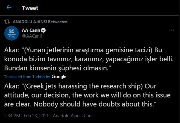 Αυτό βέβαια δεν πτόησε τον Χουλουσί Ακάρ που δήλωσε ότι «αυτή είναι μια συνηθισμένη παρενόχληση από τους Έλληνες γείτονες. Η απαραίτητη απάντηση δόθηκε εντός των νόμιμων ορίων».