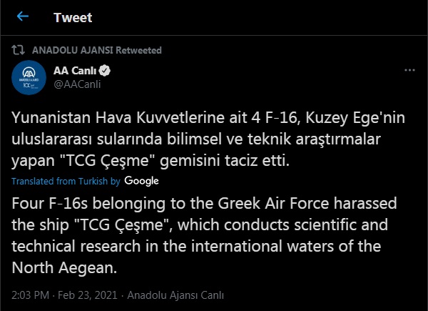«Τέσσερα F-16 που ανήκουν στην ελληνική Πολεμική Αεροπορία παρενόχλησαν το πλοίο «Τσεσμέ», που πραγματοποιεί επιστημονικές και τεχνικές έρευνες σε διεθνή ύδατα στον Βόρειο Αιγαίο», αναφέρει χαρακτηριστικά το Anadolu.
