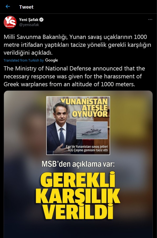 Το τουρκικό πρακτορείο ειδήσεων, επικαλούμενο πηγές του Τουρκικού Υπουργείου Άμυνας, υποστηρίζει πως «δόθηκε η πρέπουσα απάντηση» στα ελληνικά F-16, που πλησίασαν σε απόσταση χιλίων μέτρων.