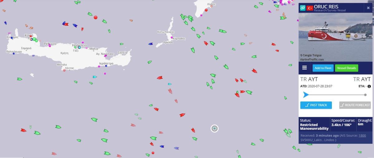 Λίγη ώρα νωρίτερα γινόταν γνωστό πως όπως μετέδωσε το Mega, μόλις οκτώ ναυτικά μίλια πριν φτάσει στο όριο της παράνομα δεσμευμένης περιοχής από την Άγκυρα, το Oruc Reis, η συνοδεία του και τα πολεμικά που το ακολουθούν άλλαξαν πορεία.