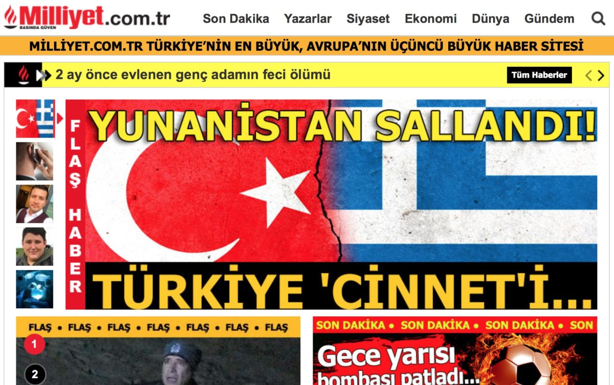 Η Τουρκία ήταν ο στόχος η Ελλάδα κλονίστηκε γράφει στον τίτλο της η ηλεκτρονική έκδοση της εφημερίδας Μιλιέτ. Στο δημοσίευμά της αναφέρεται στις πολιτικές αντιδράσεις που προκάλεσαν οι χθεσινές δηλώσεις του υπουργού Εθνικής Άμυνας κ. Πάνου Καμμένου. Με ανοίκειο τρόπο χαρακτηρίζει τον ΥΕΘΑ επικεφαλής του εθνικιστικού κόμματος ΑΝΕΛ.