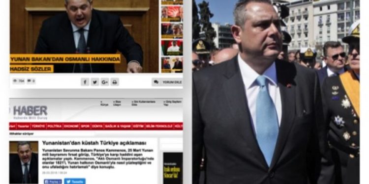 Στοχοποιούν και πάλι τον υπουργό Εθνικής Άμυνας, κ. Πάνο Καμμένο τα τουρκικά μέσα μαζικής ενημέρωσης. Ξεπερνώντας κάθε όριο προκλητικότητας γράφουν τον «Έλληνα υπουργό που γλίτωσε από τους Τούρκους στρατιώτες», θυμίζοντας το περιστατικό στα Ίμια όταν τουρκικά πλοία επιχείρησαν να εμποδίσουν τη ρίψη στεφάνου. Αφορμή οι δηλώσεις που έκανε μετά την στρατιωτική παρέλαση για την Εθνική Επέτειο της 25ης Μαρτίου 1821, τις οποίες χαρακτηρίζουν αλαζονικές και σκανδαλώδεις.