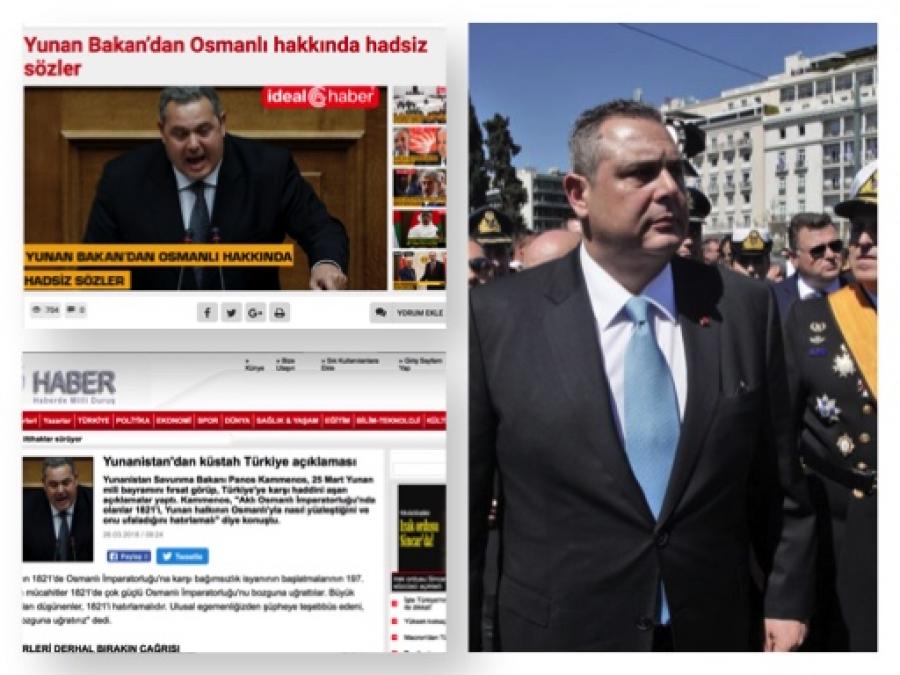 Στοχοποιούν και πάλι τον υπουργό Εθνικής Άμυνας, κ. Πάνο Καμμένο τα τουρκικά μέσα μαζικής ενημέρωσης. Ξεπερνώντας κάθε όριο προκλητικότητας γράφουν τον «Έλληνα υπουργό που γλίτωσε από τους Τούρκους στρατιώτες», θυμίζοντας το περιστατικό στα Ίμια όταν τουρκικά πλοία επιχείρησαν να εμποδίσουν τη ρίψη στεφάνου. Αφορμή οι δηλώσεις που έκανε μετά την στρατιωτική παρέλαση για την Εθνική Επέτειο της 25ης Μαρτίου 1821, τις οποίες χαρακτηρίζουν αλαζονικές και σκανδαλώδεις.