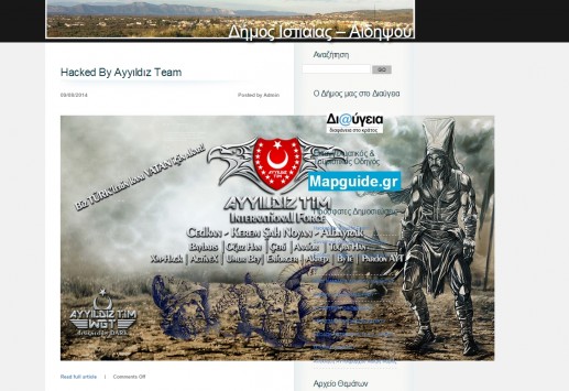 Από το Σάββατο, 9 Αυγούστου, έχει γίνει η κυβερνο-επίθεση στο site του δήμου Ιστιαίας – Αιδηψού, το οποίο εμφανίζει στην αρχική του σελίδα μία εικόνα εθνικιστικού περιεχομένου με επίκεντρο την τουρκική ημισέλινο….. ΔΙΑΒΑΣΤΕ ΠΕΡΙΣΣΟΤΕΡΑ ΕΔΩ