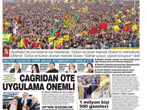 «Αποχαιρετισμός στα όπλα» είναι ο τίτλος της Milliyet. H τουρκική εφημερίδα γράφει πως « το μήνυμα ειρήνης του Οτζαλάν ήρθε την ημέρα του Νεβρόζ , όλη η Τουρκία περίμενε το μήνυμα του στο οποίο ζήτησε τον τερματισμό των μαχών και την πρόκριση της πολιτικής».