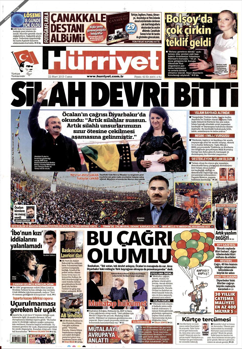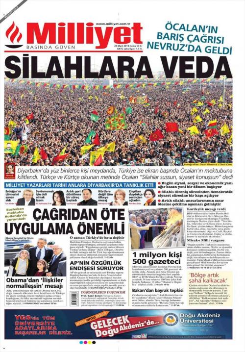 «Αποχαιρετισμός στα όπλα» είναι ο τίτλος της Milliyet. H τουρκική εφημερίδα γράφει πως « το μήνυμα ειρήνης του Οτζαλάν ήρθε την ημέρα του Νεβρόζ , όλη η Τουρκία περίμενε το μήνυμα του στο οποίο ζήτησε τον τερματισμό των μαχών και την πρόκριση της πολιτικής».