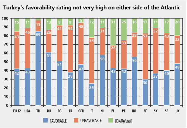 Η έρευνα αποκάλυψε και ποιες χωρες βλέπουν αρνητικα οι Τουρκοι. Μόνο 17% των Τούρκων έχουν θετική αποψη για την Ελλάδα και 9% για το Ισραήλ. Σε αντιθεση με την Γερμανια και τις ΗΠΑ, για τις οποιες 48% των Τουρκων έχουν θετική άποψη.