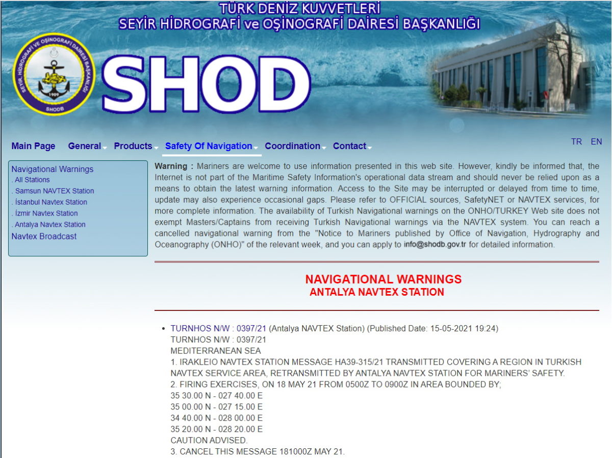 Στις 14 Μαΐου η Υδρογραφική Υπηρεσία του Πολεμικού Ναυτικού εξέδωσε NAVTEX με την οποία προειδοποιούσε για ασκήσεις με πραγματικά πυρά νοτιοανατολικά της Καρπάθου.