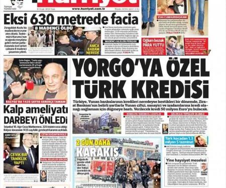 Τη σχεδιαζόμενη τουρκική οικονομική διείσδυση στην Ελλάδα αποκαλύπτει με πρωτοσέλιδο της η εφημερίδα Hürriyet. ‘Eιδικό τουρκικό δάνειο στον Γιώργο’ είναι ο τίτλος της τουρκικής εφημερίδα η οποία αποκαλύπτει πως η τουρκική πρεσβεία στην Αθήνα έχει δημιουργήσει σχέδιο «οικονομικής ενίσχυσης» της Ελλάδας. Το σχέδιο αυτό παρουσιάστηκε στις ελληνικές αρχές.