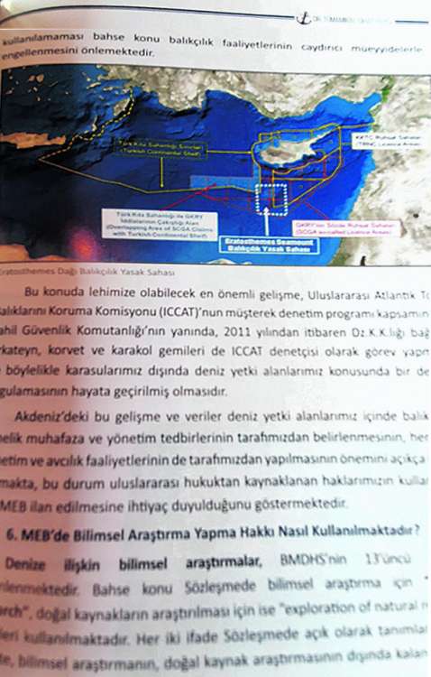 Εντύπωση προκαλεί, ωστόσο, το οπισθόφυλλο του βιβλίου, όπου δημοσιεύεται ο χάρτης της «γαλάζιας πατρίδας», με το Αιγαίο να διχοτομείται, καθώς η ανατολική πλευρά παρουσιάζεται ως θαλάσσια περιοχή της Τουρκίας. Το ίδιο συμβαίνει με την Ανατολική Μεσόγειο ανάμεσα στην Κρήτη και την Κύπρο.