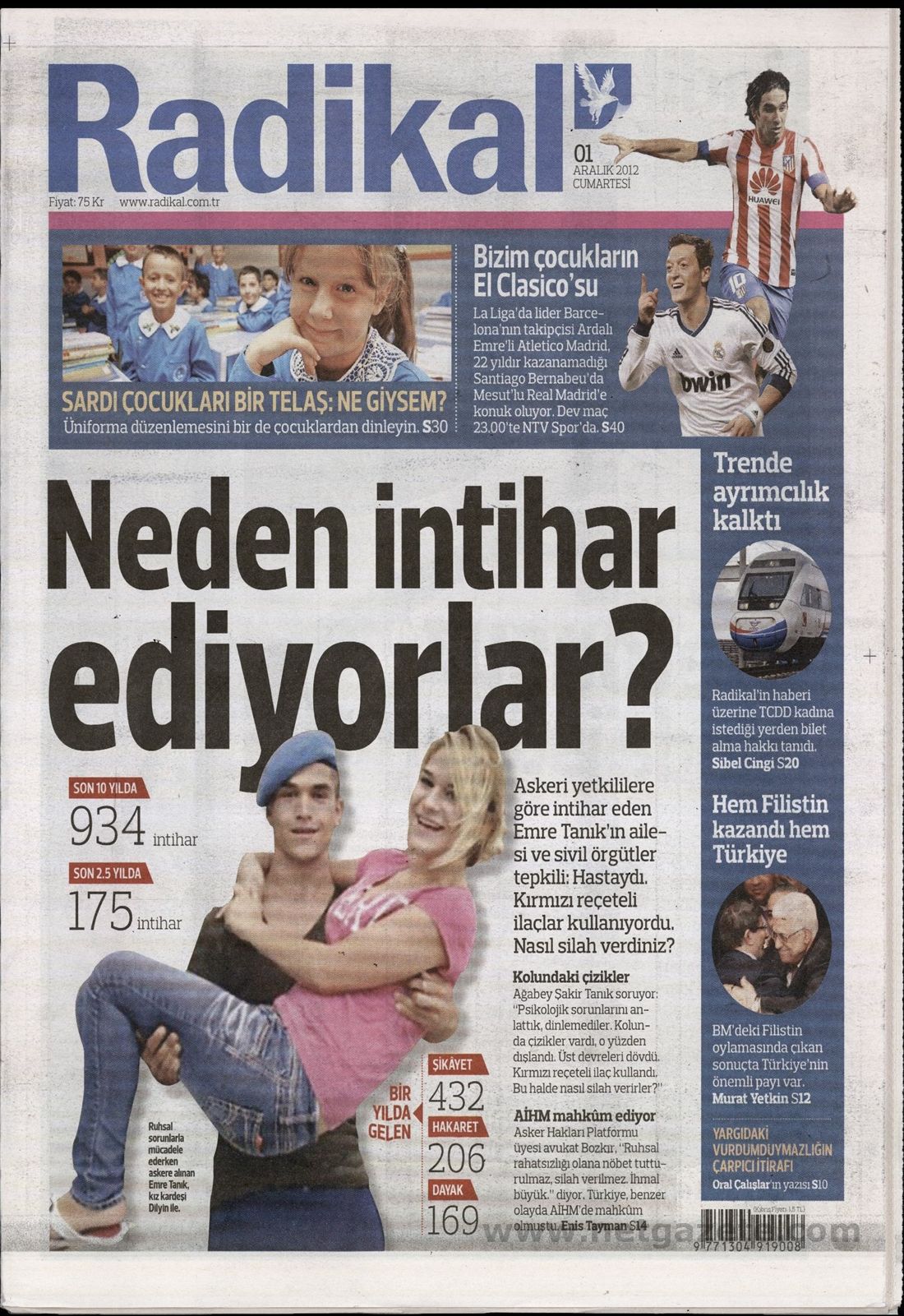 «Γιατί αυτοκτονούν» είναι ο τίτλος της Radikal. H τουρκική εφημερίδα κάνει αναφορά στις 964 αυτοκτονίες τούρκων στρατιωτών τα τελευταία 10 χρόνια. Δίνει ως παράδειγμα έναν φαντάρο , ο οποίος παρόλο που είχε ψυχολογικά προβλήματα και χρησιμοποιούσε ψυχοφάρμακα του είχε δοθεί όπλο.